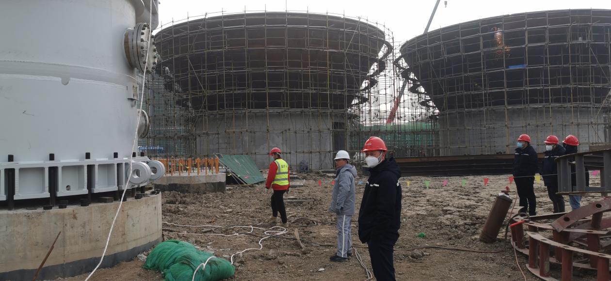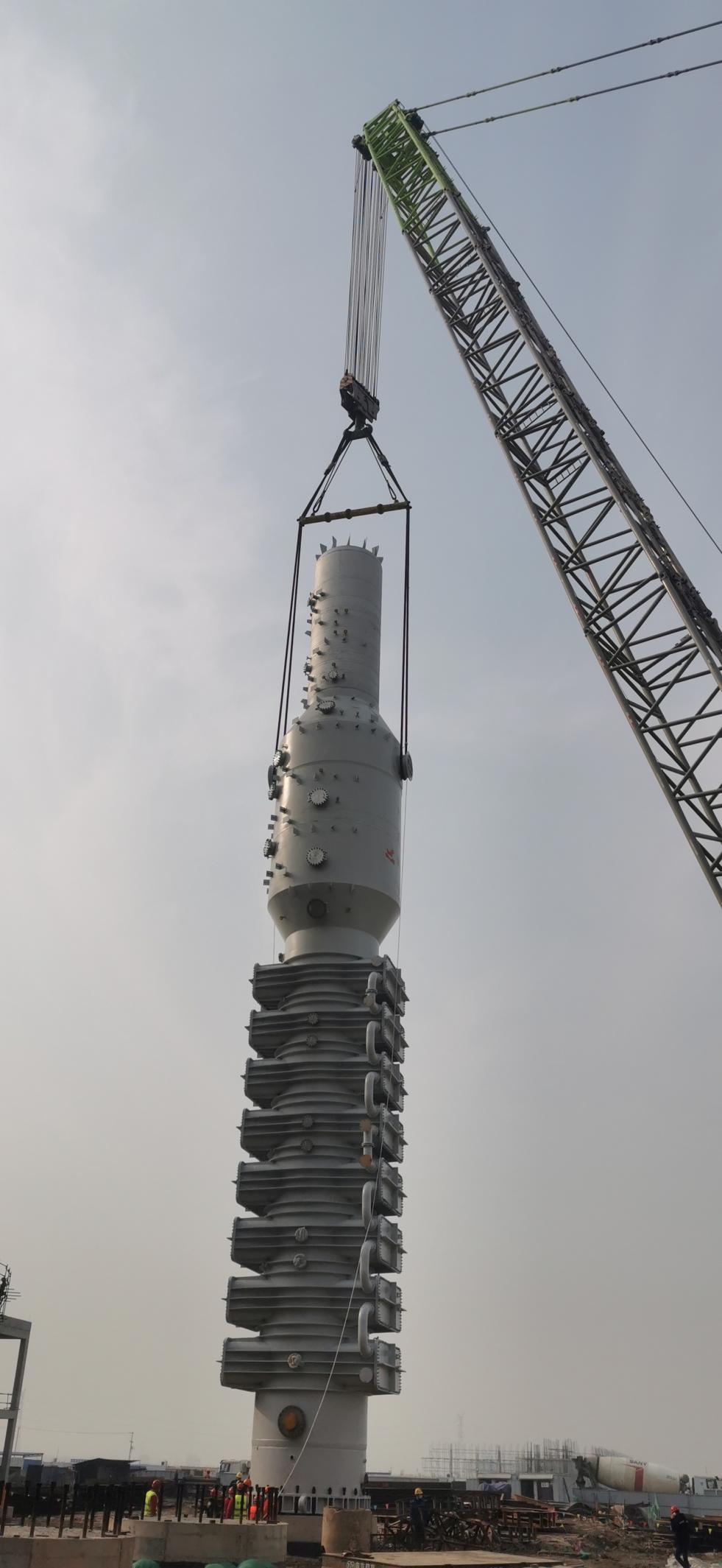2022年12月30日上午,在即將迎來2023年新年之際,興華科技公司聯(lián)堿裝置區(qū)建設(shè)現(xiàn)場正呈現(xiàn)一片火熱的安裝景象,聯(lián)堿最重要的核心設(shè)備之一碳化塔,迎來了隆重的安裝典禮,公司總經(jīng)理卓士彬、副總經(jīng)理潘杭軍、朱愛民等主要領(lǐng)導(dǎo)親臨現(xiàn)場,見證了這一令人激動的時刻。8:48分,安裝現(xiàn)場鞭炮齊鳴,建設(shè)單位向卓士彬總經(jīng)理匯報一切準(zhǔn)備就緒之后,隨著卓總的一聲令下, 1臺800噸和1臺350噸吊車相互配合,重達(dá)300多噸的碳化塔被緩緩吊起,聯(lián)堿項目部李志經(jīng)理親自把關(guān)設(shè)備方位、標(biāo)高、找正等技術(shù)關(guān)鍵點,確保一次準(zhǔn)點到位,經(jīng)過1個多小時的調(diào)整,第一臺碳化塔穩(wěn)穩(wěn)得座落在設(shè)備基礎(chǔ)之上,經(jīng)過公司能源動力部、項目部、監(jiān)理單位以及施工方多次反復(fù)確認(rèn),確保碳化塔精準(zhǔn)無誤地落在基礎(chǔ)上面,圓滿安全地完成了第一臺碳化塔起吊安裝工作,標(biāo)志著興華科技聯(lián)堿設(shè)備安裝開始進(jìn)入一個新的高潮。目前聯(lián)堿整個設(shè)備安裝預(yù)計在元旦和年后即將全面鋪開,為項目建設(shè)如期開工,興華科技公司全體員工都在全力拼搏。
