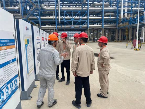 目前興華科技公司部分裝置建設已進入尾期,裝置基本完成,現場目視管理標識牌暫未設置,經過石化基地安全業主委員會協調, 7月12日,興華科技公司相關安全管理人員,赴連云港石化有限公司現場觀摩學習目視管理。在連云港石化HSE部門姜輝經理和安全工程師汪起榮帶領下,觀摩學習人員重點參觀了空分裝置、罐區裝置。參觀過程中汪起榮工程師詳細給大家介紹了現場標識牌的設置要求以及注意事項?,F場學習后,姜經理又詳細的講解一些設置標識牌的經驗和先進的管理方法。